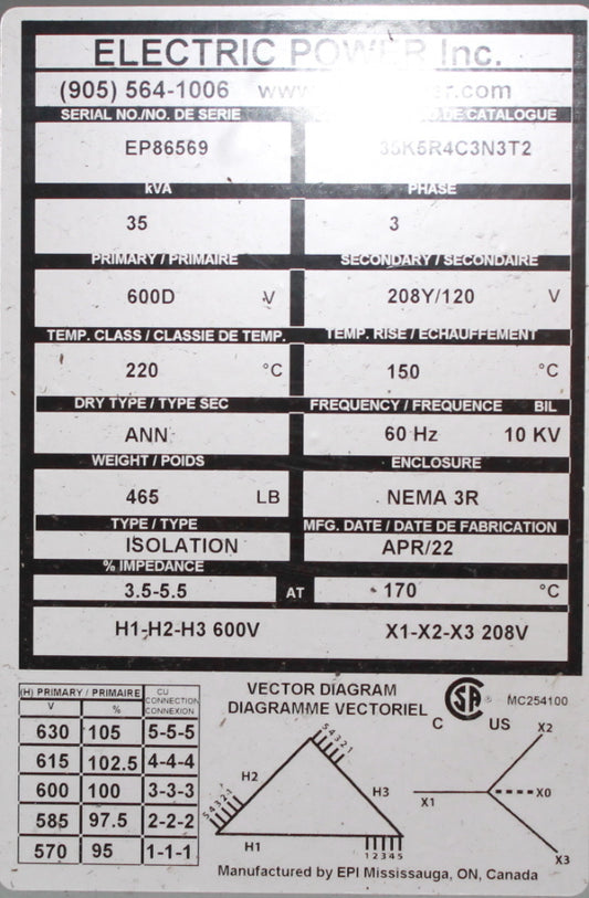 35 kVA EPI Reconditioned Transformer 600-120/208V Cat No 35K5R4C3N3T2 SKU 3053