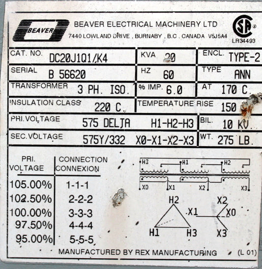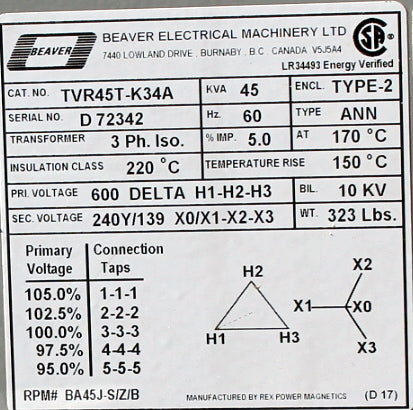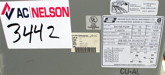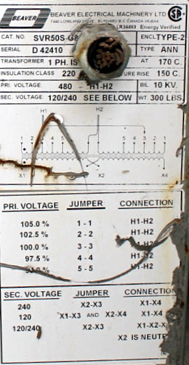 15 kVA BEAVER Reconditioned Transformer 240D-480Y/277V Cat No TVR15K-S34A3 SKU 3351