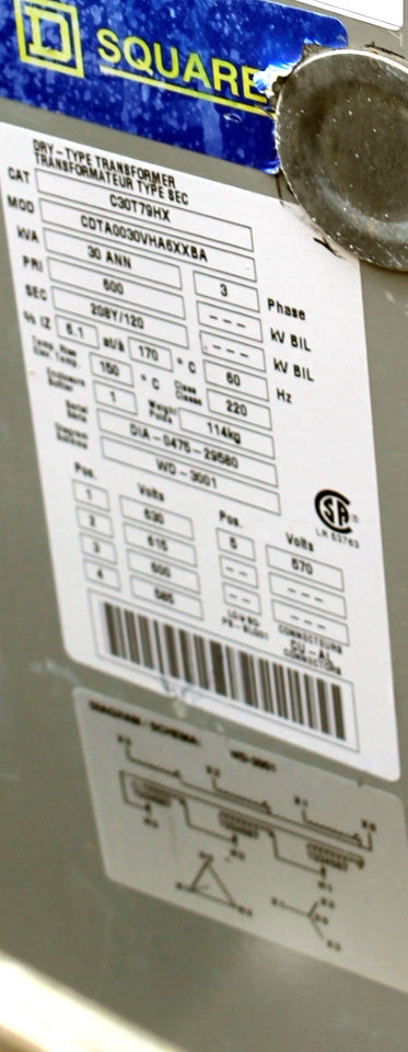 30 kVA SQD Reconditioned Transformer 600-120/208V Cat No C30T79HX SKU 3086