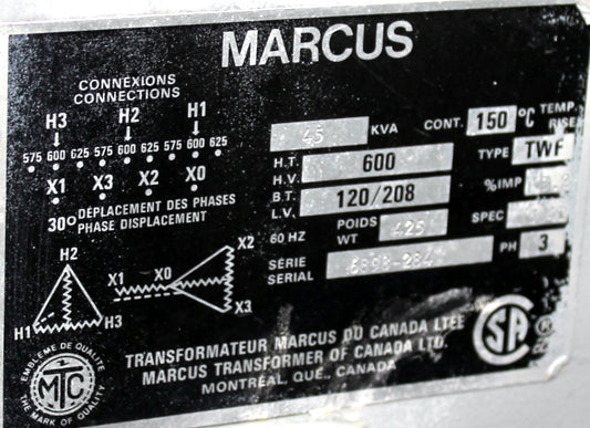 45 kVA MARCUS Reconditioned Transformer 600-120/208V Cat No 6898-284 SKU 3109
