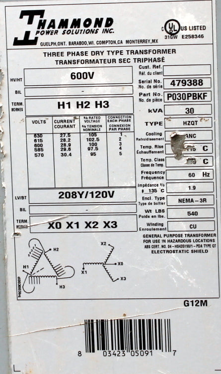 30 kVA HPS Reconditioned Transformer 600-120/208V Cat No 222525 SKU 3388