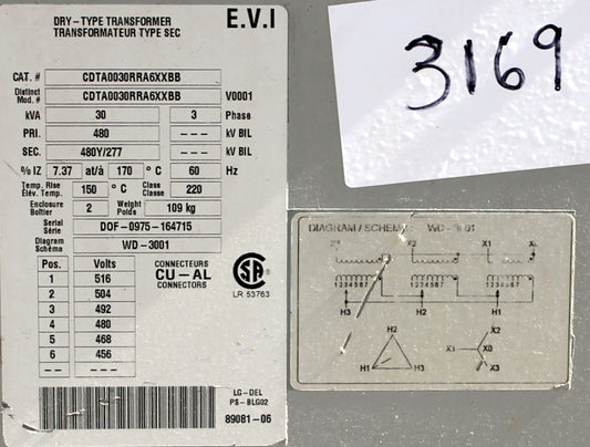 30 kVA HPS New Transformer 480-208Y/120V Cat No EG3A0030KB SKU 1014