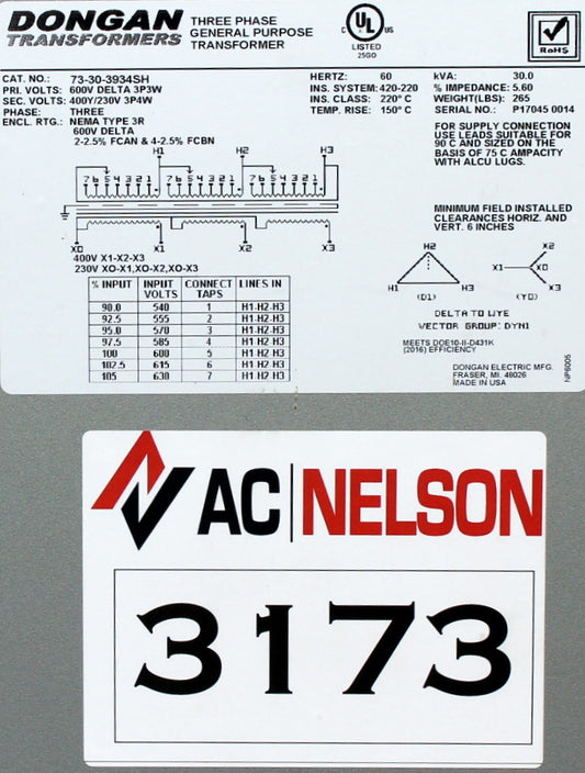 30 kVA DONGAN Reconditioned Transformer 600-400/230V Cat No 73-30-39345H SKU 3173