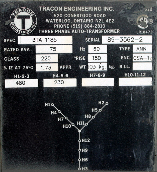 75 kVA TRACON Reconditioned Transformer 480-230V Cat No 3TA1185 SKU 3202