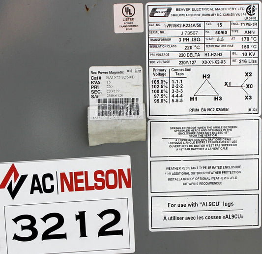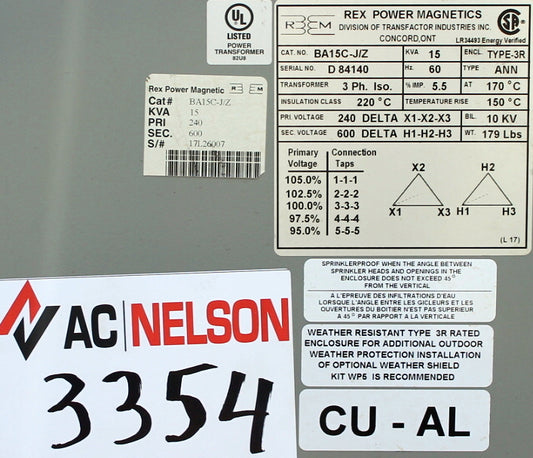15 kVA REX Reconditioned Transformer 240-600V Cat No BA15C-J12 SKU 3354