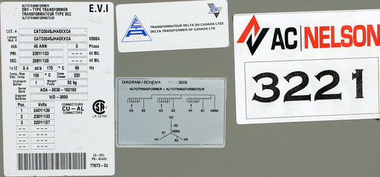 45 kVA DELTA Reconditioned Transformer 230/133-208/120V Cat No CATC0045JAH6XXCA SKU 3221
