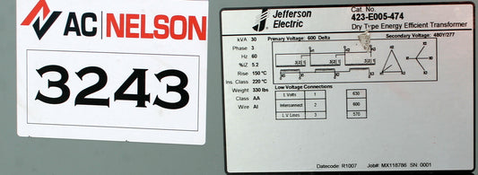 30 kVA JEFFERSON Reconditioned Transformer 600-277/480V Cat No 423-E005-474 SKU 3243
