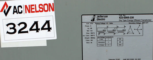 27 kVA JEFFERSON Reconditioned Transformer 600-277/480V Cat No 423-E005-230 SKU 3244