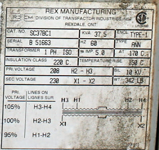 37.5 kVA REX Reconditioned Transformer 208-230V Cat No SC37BC1 SKU 3258