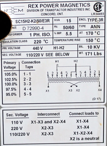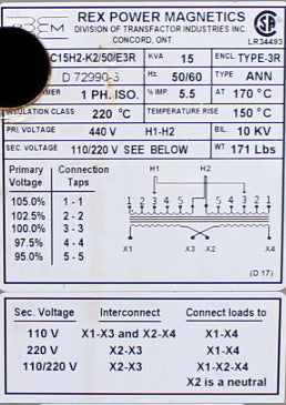 15 kVA REX Reconditioned Transformer 440-110/220V Cat No SC15H2-K2/50/E3R SKU 3265