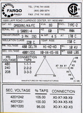 93 kVA FARGO Reconditioned Transformer 480-400/231V Cat No DA93XNI/K4/FE SKU 3275