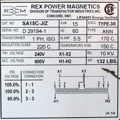 15 kVA REX Reconditioned Transformer 240-600V Cat No SA15CJ/Z SKU 3287