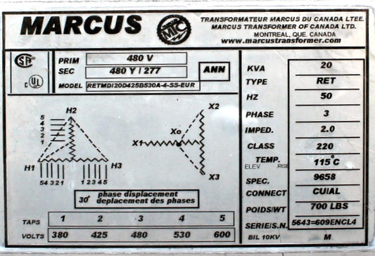 20 kVA MARCUS Reconditioned Transformer 480-480/277V Cat No RETMD120D425B530A-4-SS-EUR SKU 3298