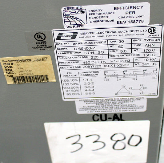 30 kVA REX Reconditioned Transformer 480-120/208V Cat No BA30H-M/Z/E3R/EDM SKU 3380
