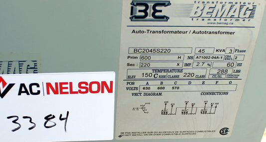45 kVA Bemag Reconditioned Transformer 600-220V Cat No BC20458220 SKU 3384