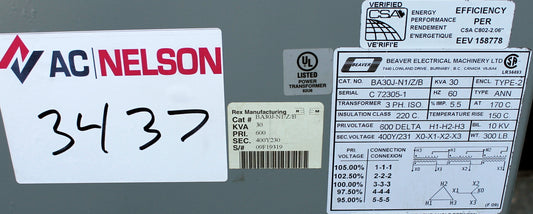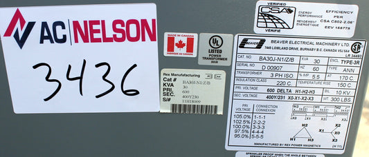 30 kVA Rex Reconditioned Transformer 600-400/231V Cat No BA30J-N1/Z/B SKU 3437